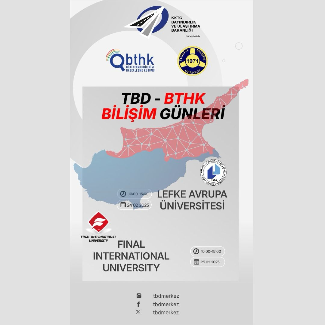 Bilgi Teknolojileri ve Haberleşme Kurumu (BTHK) ile Türkiye Bilişim Derneği (TBD), işbirliği protokolü çerçevesinde önümüzdeki hafta "KKTC Bilişim Günleri” etkinliği düzenliyor.