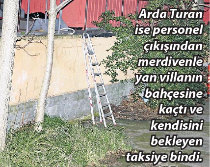 Mekan çıkışı görüntü vermek istemeyen Arda Turan'a çalışanlar tarafından kaçırma operasyonu düzenlendi. Turan, personel çıkışından merdivenle yan villanın bahçesine kaçıp kendisini bekleyen taksiyle Etiler'den kaçtı.