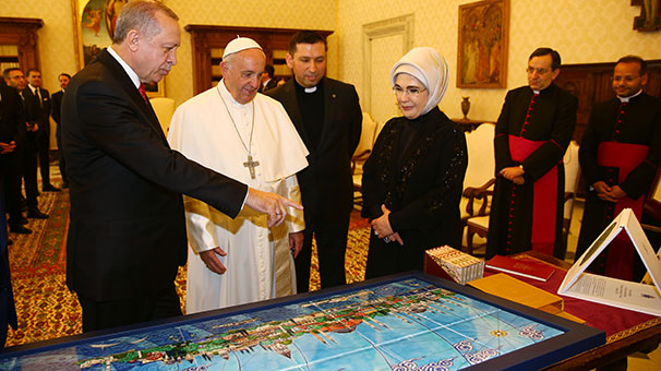 Cumhurbaşkanı Recep Tayyip Erdoğan, Papa Franciscus'un davetlisi olarak Vatikan'a gitti. Erdoğan törenle karşılandı. Cumhurbaşkanı Erdoğan'ın, Vatikan'da Katoliklerin ruhani lideri Papa Franciscus ile bir saat süren baş başa görüşmesi sona erdi.