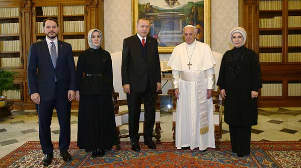 Cumhurbaşkanı Recep Tayyip Erdoğan Papa Franciscus Vatikan'da görüşütü. Cumhurbaşkanı Recep Tayyip Erdoğan,için, Katoliklerin ruhani lideri Papa Franciscus ile baş başa görüşmek üzere geldiği Apostol Sarayı önünde tören düzenlendi. Cumhurbaşkanı Erdoğan ve eşi Emine Erdoğan, San Damaso Kapısı'nda Papalık İkametgah Valisi Başpiskopos Georg Ganswein tarafından karşılandı. Karşılama töreninin ardından Cumhurbaşkanı Erdoğan, Papa Franciscus ile baş başa görüşmenin yapılacağı salona geçti.