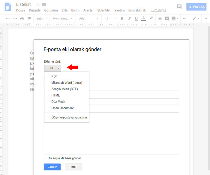Google Dokümanlar dahilindeki bir başka vakit kazandıran özellik de, dokümanı e-posta eki olarak gönderebilme fonksiyonu. Hazırladığınız dokümanın kopyasını başkalarına göndermek istiyorsanız “Dosya” menüsünün altında bulunan “E-posta eki olarak gönder” butonuna tıklayarak fazlasıyla vakit kazanabilirsiniz. Üstelik bu seçenek dahilinde göndereceğiniz dosyanın formatını da seçebiliyorsunuz.