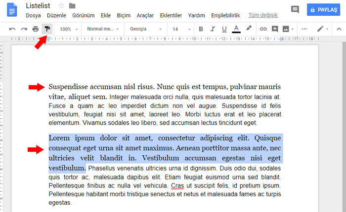 Örneğin yazınız Arial fontunda ve 12 punto boyutunda ilerliyor. Birkaç bölgeyi Georgia formatında 14 punto ve bold yapmanız gerekirse ne yaparsınız? Bu işin epey vakit alacağını tahmin edebiliyoruz ama üzülmeyin, Google Dokümanlarda bunun bir kısayolu mevcut. Üst menüde yer alan ve boya rulosu ikonuna sahip olan “Biçimi boya” fonksiyonu bu tarz işlerde hayatınızı kolaylaştıracak.