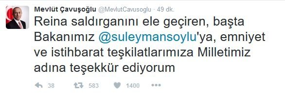 Dışişleri Mevlüt Çavuşoğlu attığı bir tweetle İçişleri Bakanı Süleyman Soyluyu Reina saldırganın yakalanması nedeniyle tebrik etti.