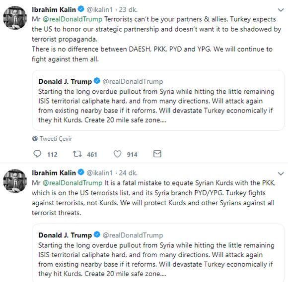 Twitter hesabından Trump'ın tepki çeken paylaşımına yanıt veren Kalın, "Sayın Donald Trump, Kürtleri ABD'nin terör listesindeki PKK ve onun Suriye kolu PYD/YPG ile eş tutmak ölümcül bir hata. Türkiye teröristlerle mücadele diyor Kürtlerle değil. Kürtleri ve diğer Suriyelileri terör tehdidine karşı koruyacağız." ifadelerini kullandı.