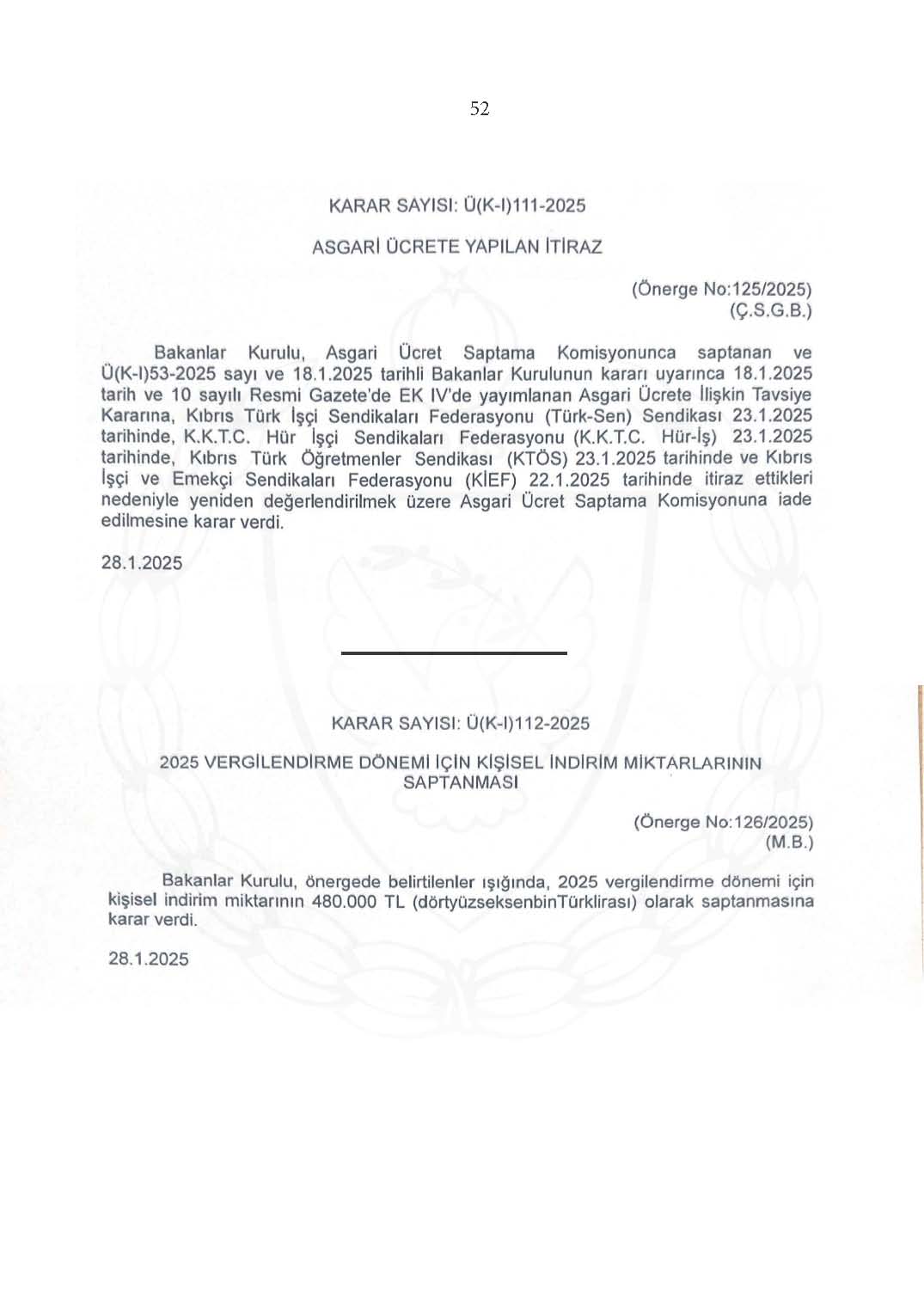 “Bakanlar Kurulu, Asgari Ücret Saptama Komisyonunca saptanan ve Ü(K-1)53-2025 sayı ve 18.1.2025 tarihli Bakanlar Kurulunun kararı uyarınca 18.1.2025 tarih ve 10 sayılı Resmi Gazete'de EK IV'de yayımlanan Asgari Ücrete İlişkin Tavsiye Kararına, Kıbrıs Türk İşçi Sendikaları Federasyonu Sendikası (Türk-Sen) 23.1.2025 tarihinde, K.K.T.C. Hür İşçi Sendikaları Federasyonu (K.K.T.C. Hür-İş) 23.1.2025 tarihinde, Kıbrıs Türk Öğretmenler Sendikası (KTÖS) 23.1.2025 tarihinde ve Kıbrıs İşçi ve Emekçi Sendikaları Federasyonu (KIEF) 22.1.2025 tarihinde itiraz ettikleri nedeniyle yeniden değerlendirilmek üzere Asgari Ücret Saptama Komisyonuna iade edilmesine karar verdi.”